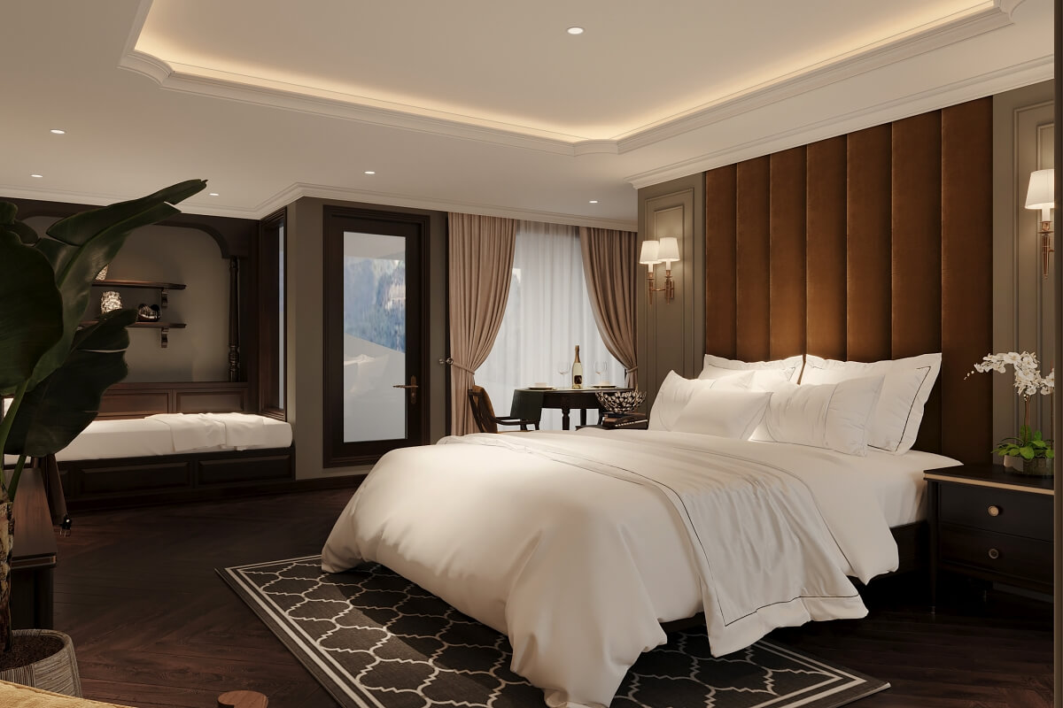 The suite offers floor-to-ceiling windows and an ocean-view bathtub. Indochine elegance meets comfort, available in Double, Twin, Triple, and family options.