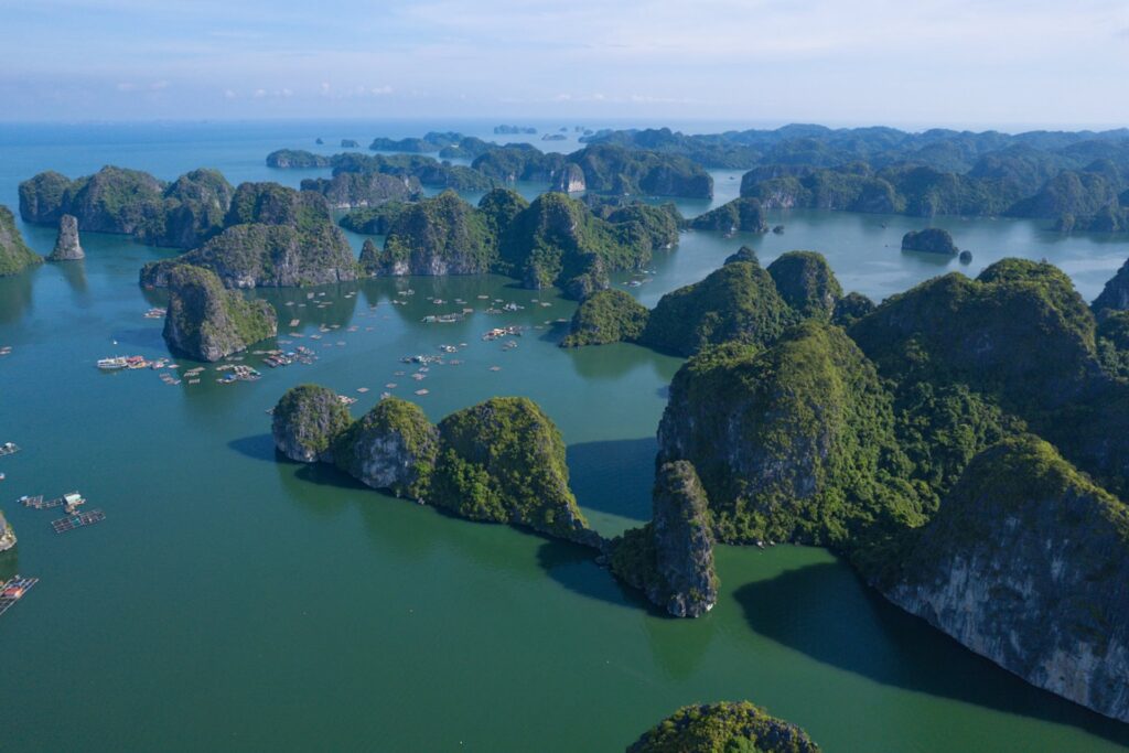- Green limestone islands: Each is covered in forest, adding a sense of warmth and life to the seascape.