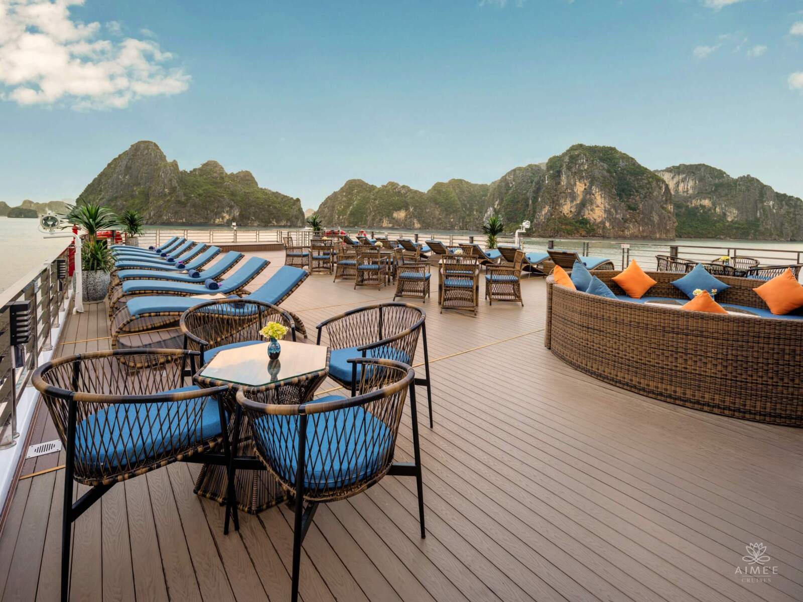 The Sundeck is the crown jewel of Aime’e Cruises, offering the most breathtaking panoramic views of Halong Bay. Perched at the very top of the vessel, it is the perfect spot to soak up the sun, admire sunrise or sunset, and feel the refreshing sea breeze while surrounded by the bay’s emerald waters and limestone cliffs.