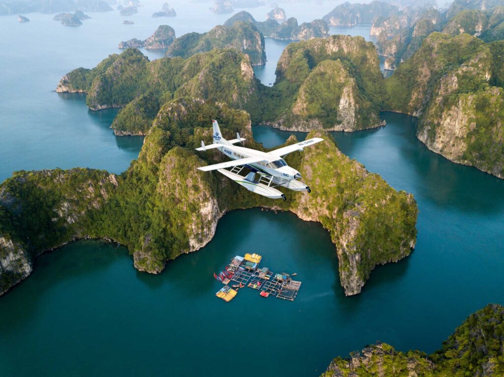 For travelers seeking something extraordinary, the Hai Au Aviation seaplane offers an unforgettable way to reach Halong Bay. The 45-minute flight provides a unique perspective of Vietnam’s coastline, rivers, and the limestone islands of Halong Bay from above.